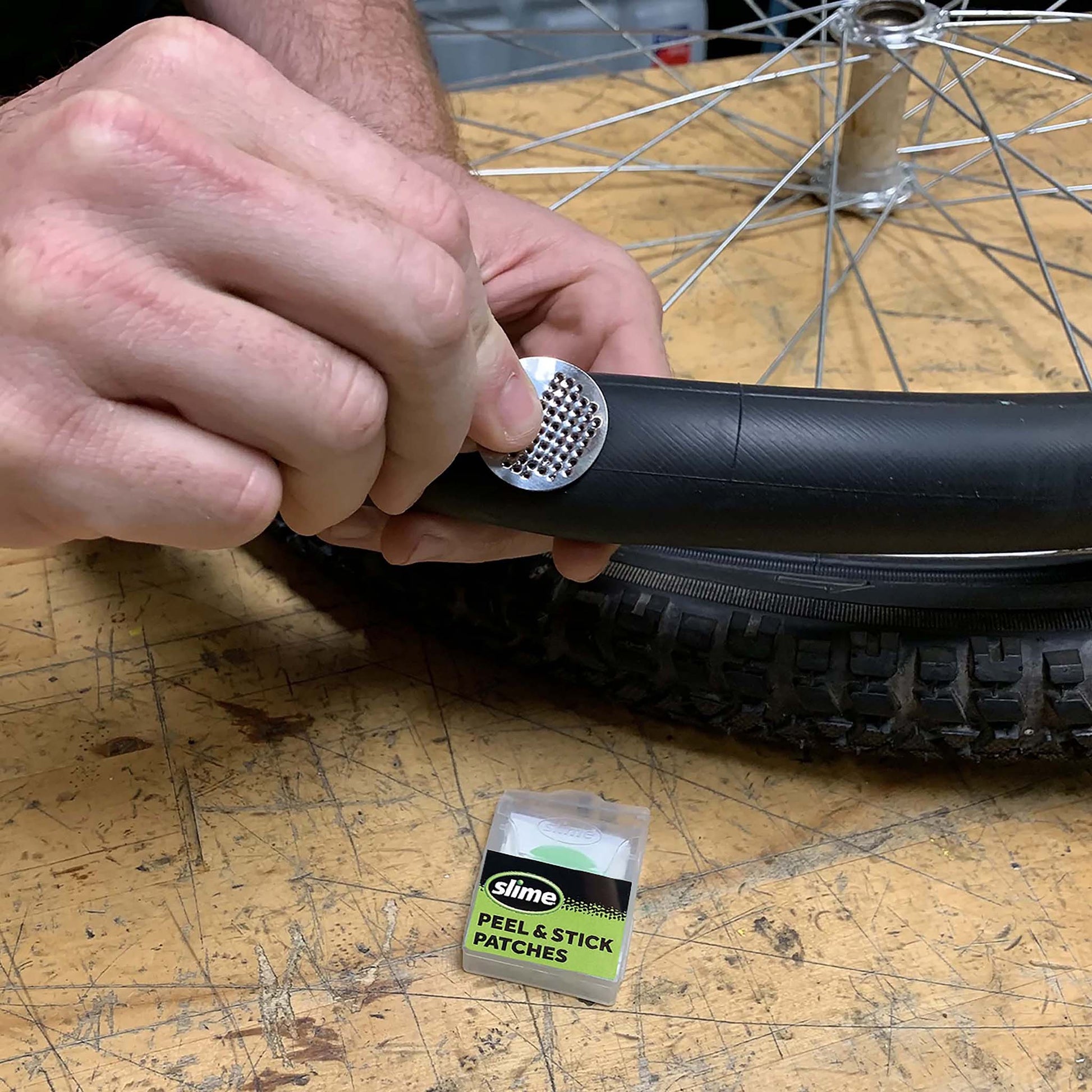De zelfklevende Slime bandenplakkers zijn direct klaar voor gebruik: ruw het oppervlak licht op, plak de patch erop en je band is weer luchtdicht.
